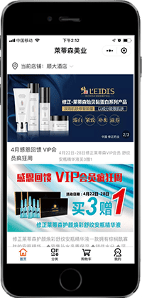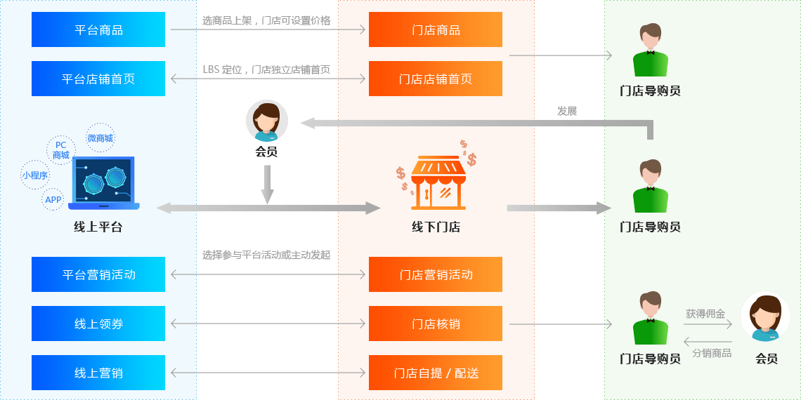 线上商城和线下多门店并重,通过门店员工导购、裂变分销、完成线上、线下营销互动;