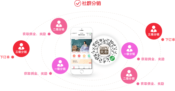 招募粉丝,不断裂变,通过佣金激励粉丝将商品分享到微信群、朋友圈,实现社群传播,产生订单