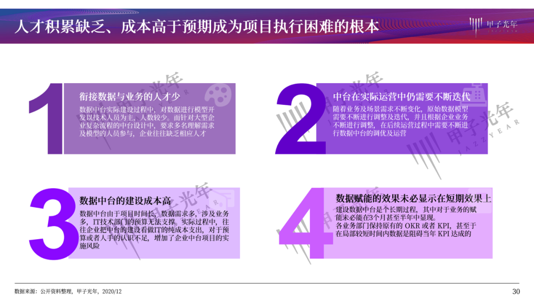 2015年,阿里提出的“大中台、小前台”战略,其中“数据中台”概念首次出现,近几年来,知名互联网企业开始了内部中台的建立,数字化服务商也推出了“数据中台”服务,虽然目前各类中台的定义尚未统一,但均强调数据及分析技术对于前台业务的复用价值。