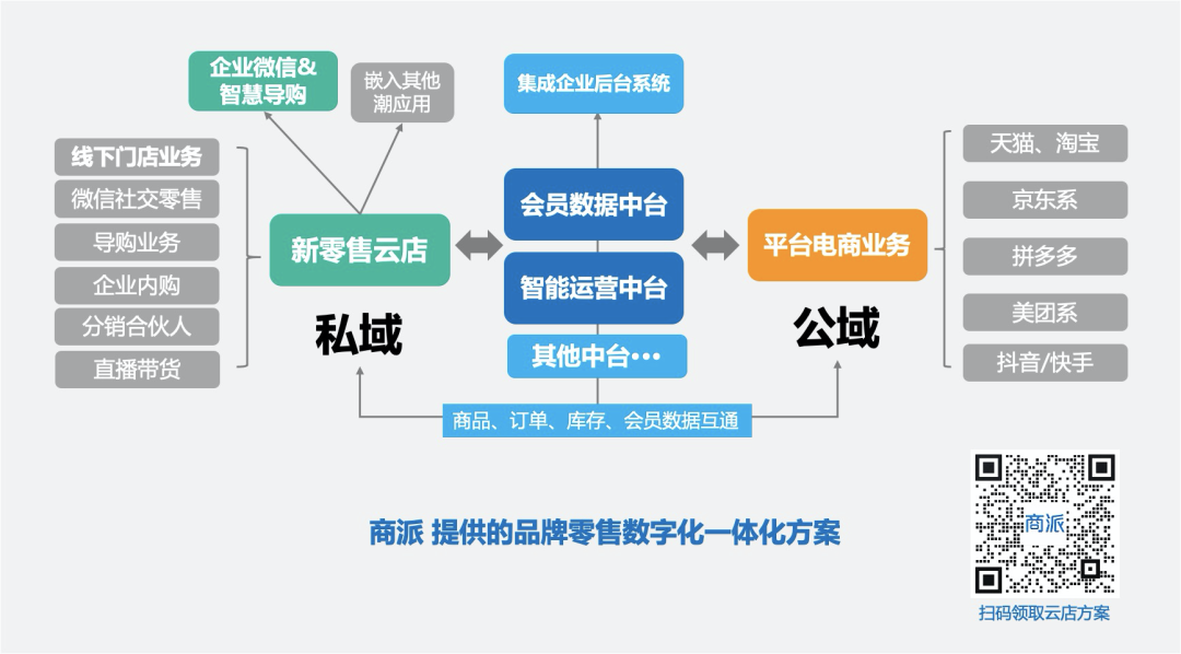 通过商派提供的系统集成服务,「新零售云店」协助零售企业完成了“私域和公域合营、线上和线下融合、前端和中台一体化、内部和外部系统集成”的零售数字化新格局。