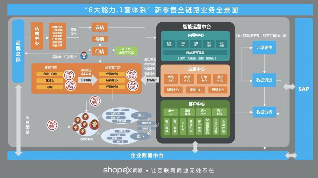 笔者曾经撰文说明,商派的「新零售云店」不是微商城,更不是线下门店的附属渠道。发展至今,背靠12亿微信生态用户,再结合腾讯数字化工具(小程序+企业微信+公众号+视频号+微信搜索等),「新零售云店」不断迭代发展,已经集合了品牌的导购业务、会员业务、门店业务、分销业务、内购业务,以及串联了数据中台和智能运营中台系统,成为系统性经营品牌私域零售业务的大本营。