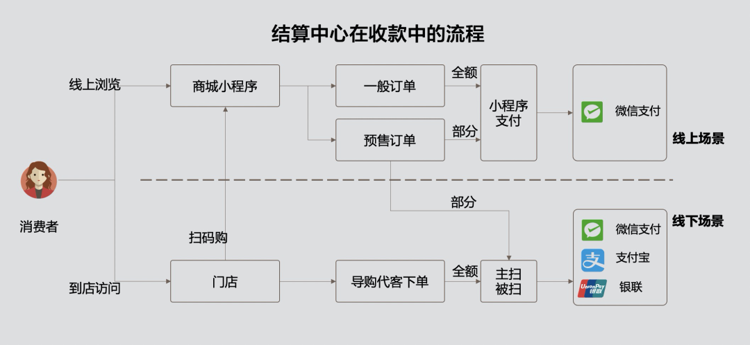 新零售云店系统支持各类场景支付,通过灵活的支付能力,支持复杂业务逻辑下的收款服务。如线上/线下,扫码/被扫,支付宝/微信/银联,小程序,公众号;以及一次性支付、混合支付(+积分)、部分支付(支持多次支付以完成订单)。