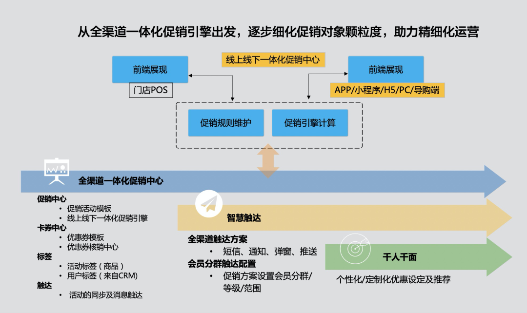 「新零售云店系统,从全渠道一体化促销引擎出发,逐步细化促销对象颗粒度,助力精细化运营,多样的促销方案在各个场景中的灵活设置。