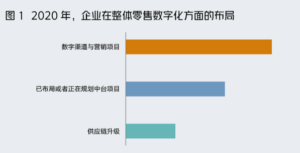 无论是品牌方或零售端,都已意识到零售数字化转型势不可挡。在访谈中,当被问及“2020年在整体零售数字化方面做了哪些布局”时,排在第一的是“数字渠道与营销项目”,如实体店升级云生意、盘活私域运营、升级会员体系等;排在第二的是零售企业已布局或者正在规划中台项目,如数据中台、智能运营中台等(图1)。