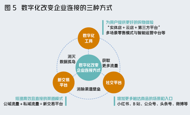 2021年,“公域私域合营、线上线下融合”会成为大多数零售企业必然需要面对的经营现状,公域私域合营意味着企业需要持续主动构建流量入口,并且掌握“全渠道流量进私域”的精细化运营能力。线上线下融合则实现了企业全渠道、全时空、全触点连接用户的方式,借助“云店、智慧导购、企业微信等数字化工具可以为用户提供更美好的个性化购物体验(图5)。