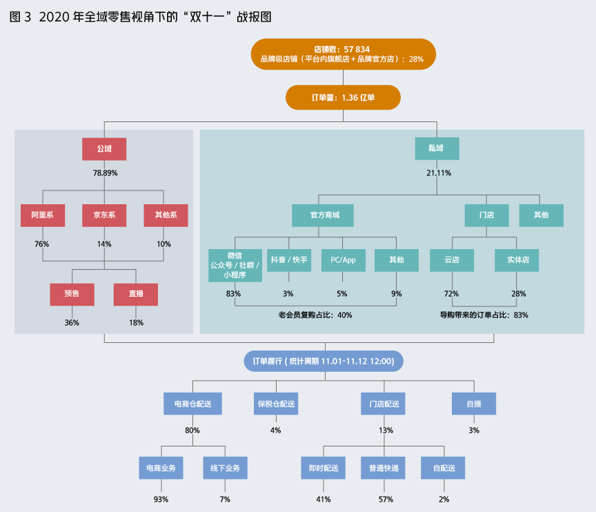 2020年双十一结束后,零售数字化圈内流出的一张从品牌全域零售视角展开的双十一战报图表引起了行业人士的格外关注(图3)。