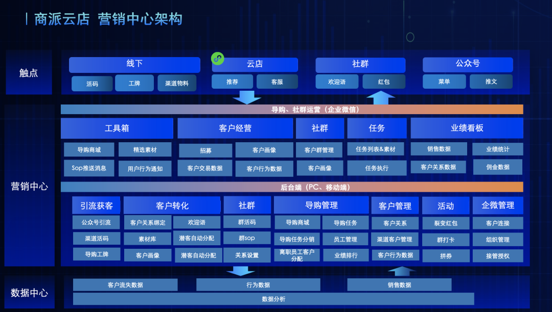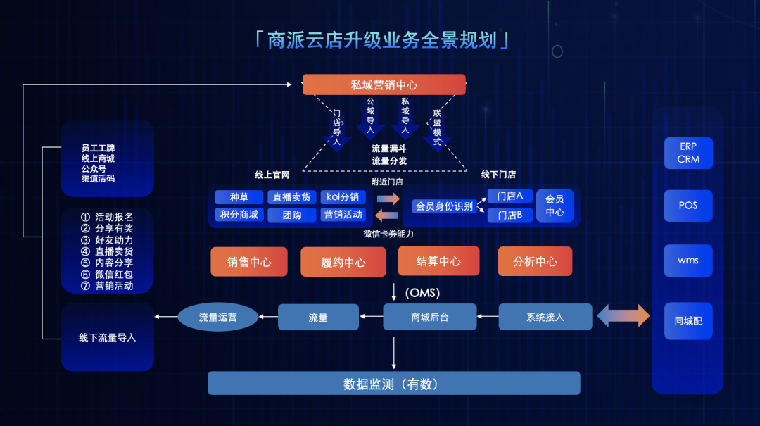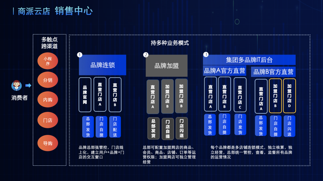在公域转私域、私域流量运营、导购数字化、线上线下互相赋能、前端与中台融合等方面,商派品牌云店系统依托于企业微信、智慧导购模块、oneX智能运营中台、全渠道分账解决方案、后台系统集成服务等综合优势,使得品牌云店系统在解决集团多品牌业务、多层级经销商业务、连锁多门店业务等方面,具备了独家的市场竞争力。