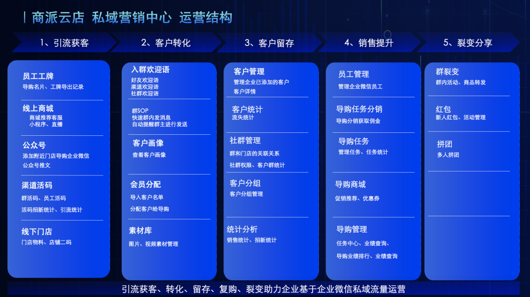 在品牌云店系统的内有专门的私域营销中心,便于品牌基于“引流、转化、留存、销售、裂变”模型,高效开展私域流量运营。