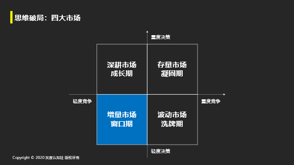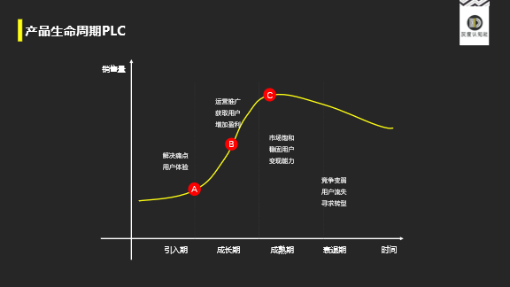 在A点时,这个市场开始高速增长。需求远大于供给,就有自然流量,坐在家里面就会有别人找我们。这时候是轻度决策和轻度竞争。