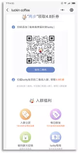 欢迎加入瑞幸福利社~ 每天都有各类饮品券小游戏及丰富活动,记得来参与! 首次进群用户3.8折饮品券将于5分钟左右自动发至luckin coffee账户~ 如未领到,请回复【入群福利】点击群内小程序领取哦~