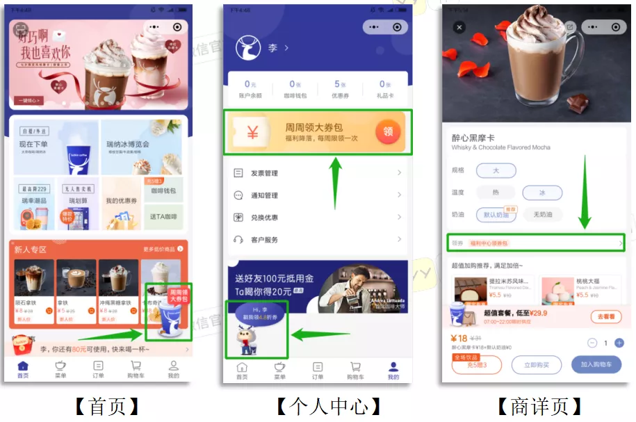 但对于老用户的触达层面,由于App和小程序触达的路径比较长,入口比较深,有效触达率并不高,App通过消息推送方式进行触达,小程序当时没有直接触达用户的路径,只能通过短信push的方式进行触达,这种触达方式显然比较有限。故瑞幸咖啡和拉新的方式一样采用大额优惠券的奖励方式来进行刺激老用户进行复购,推荐新用户可获取大额优惠券,不定期做优惠券发放活动,通过App消息推送、短信推送以及社交圈的分享裂变的方式传播。