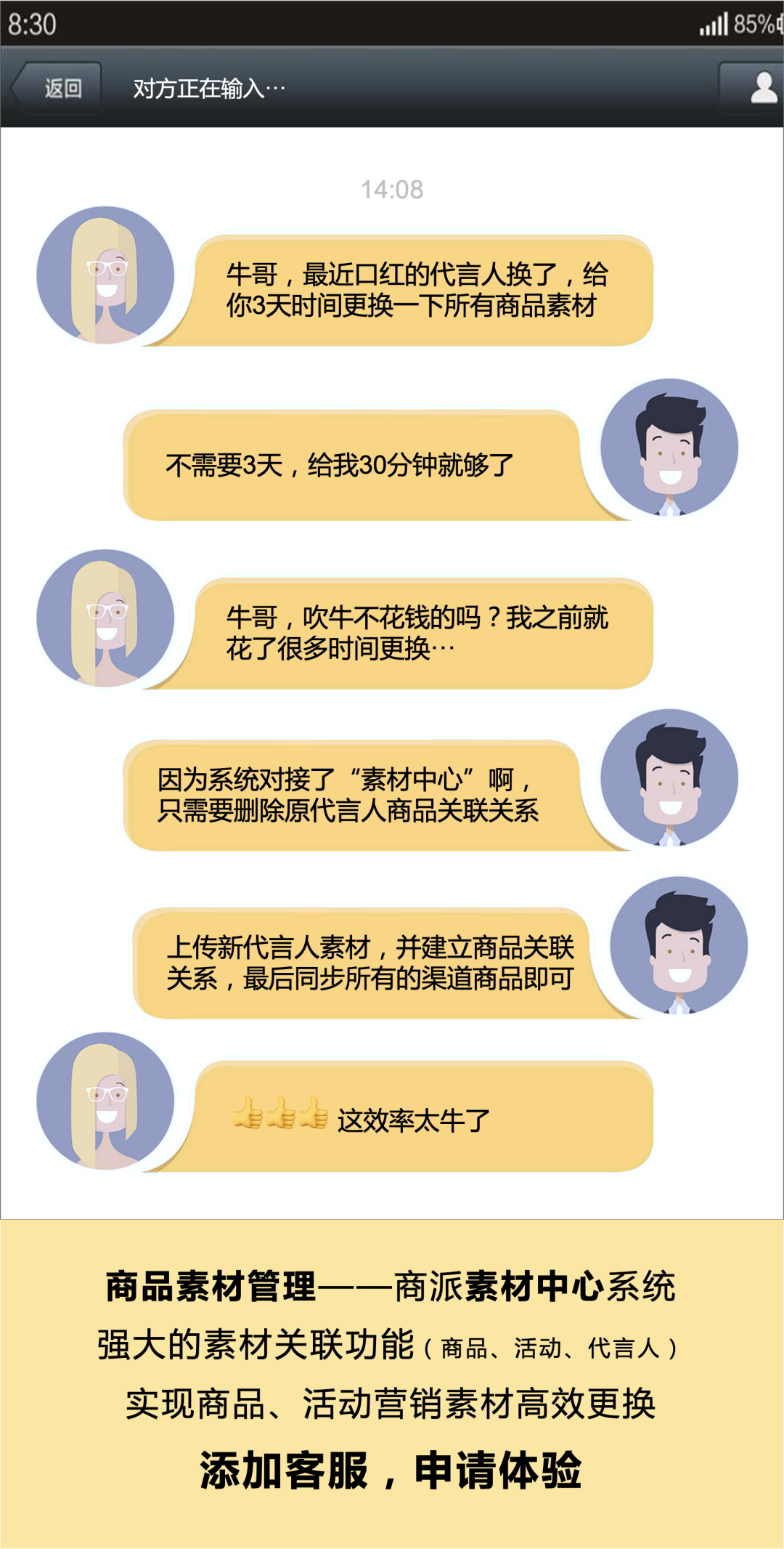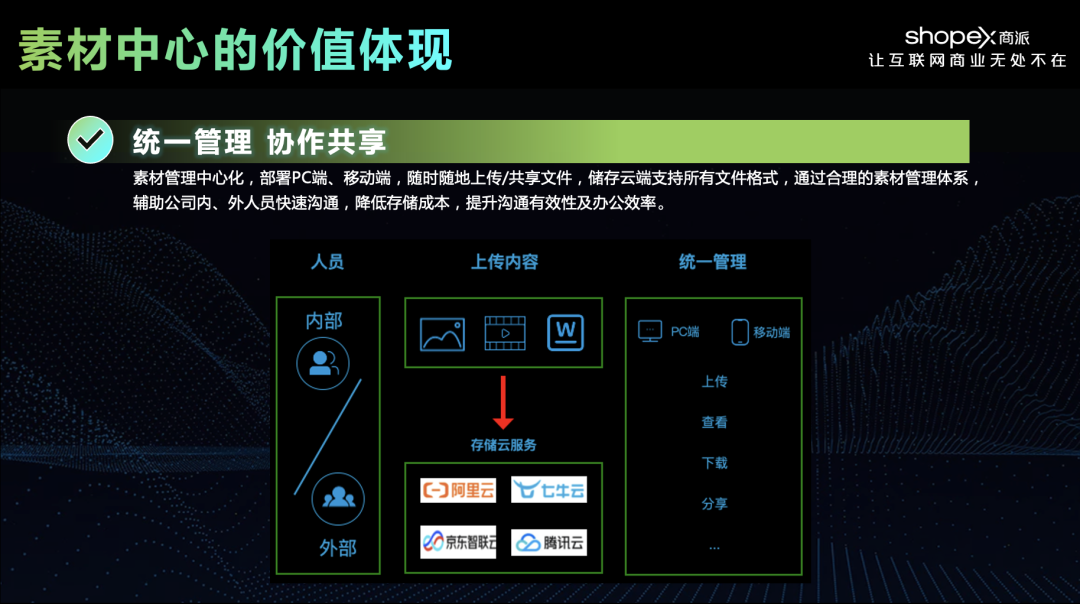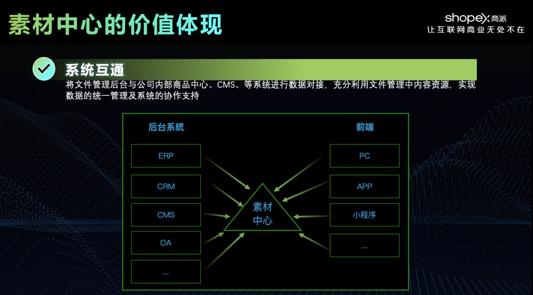 商派的素材中心不仅仅可以单独使用,还可以对接打通企业的ERP、CRM、DMP和OA等后台系统,也可以对接企业的PC、APP、小程序等前端系统。素材中心可以作为“底座”与其他系统深度整合,打通系统之间的协作,提升素材的使用价值。