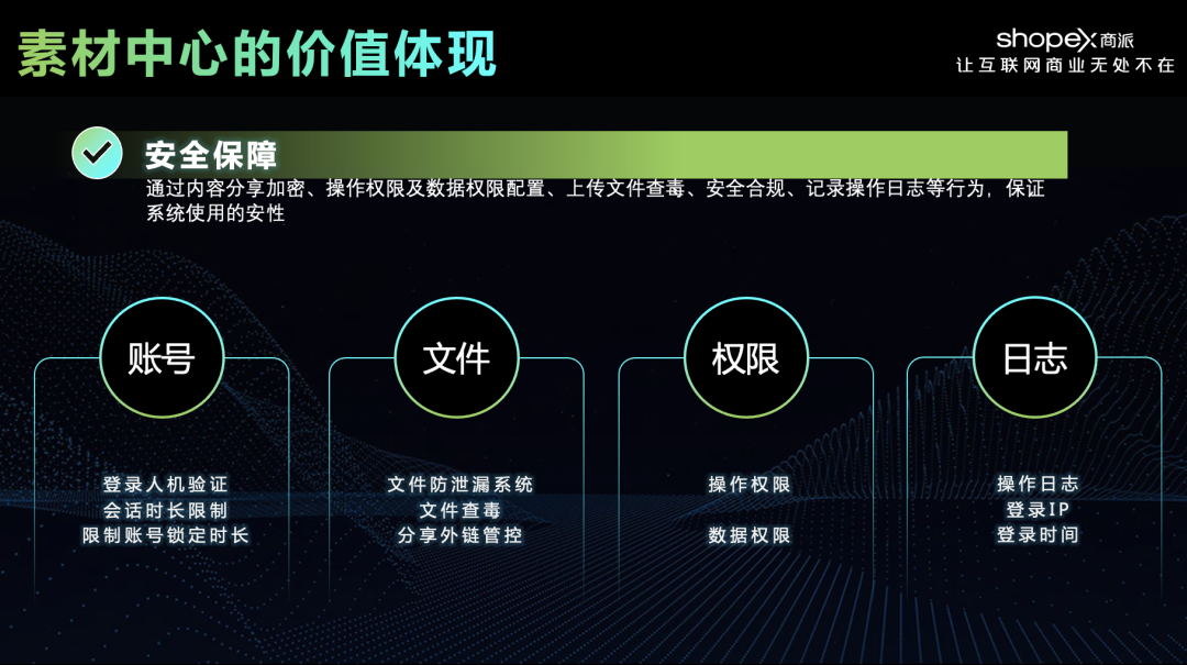 此外,集团企业面临的是“百万级的素材存储量”,十分注重文件的安全性。商派“素材中心”内提供了完善权限配置,系统可根据角色的不同配置“操作权限和数据权限”,通过严格的权限管理,有效控制企业内部/和外部人员的素材使用权限,保障素材的安全性。