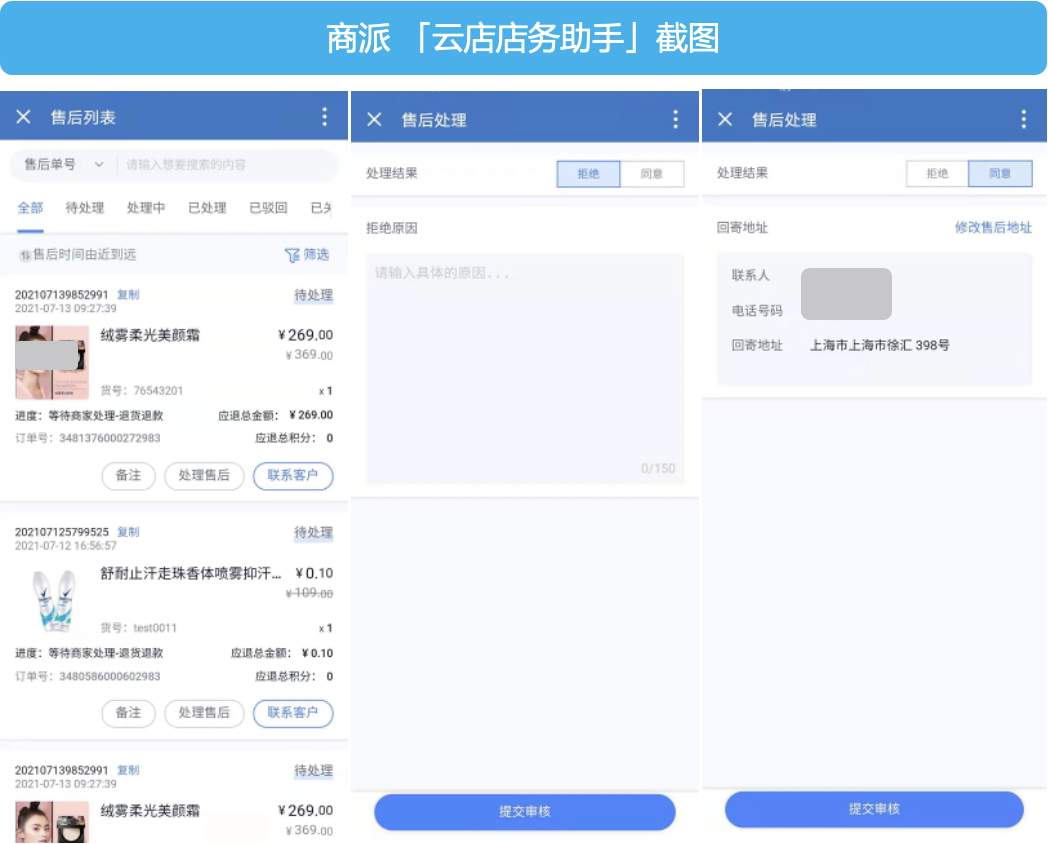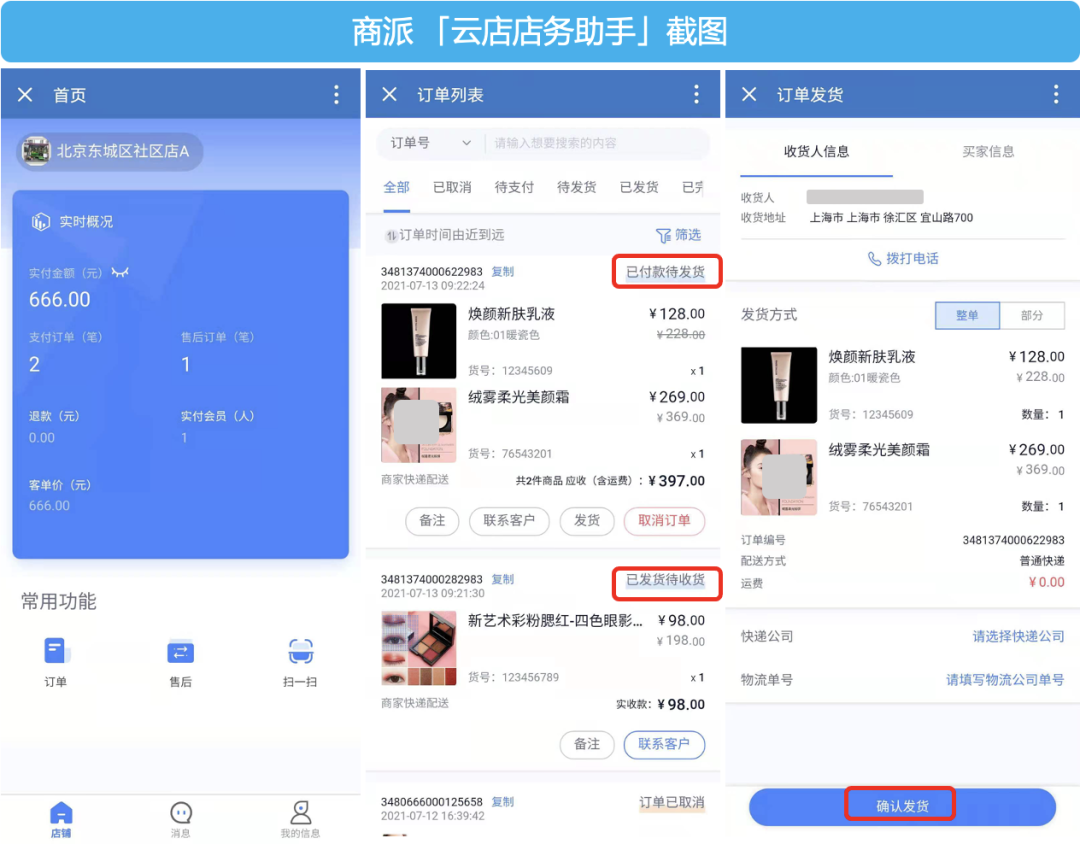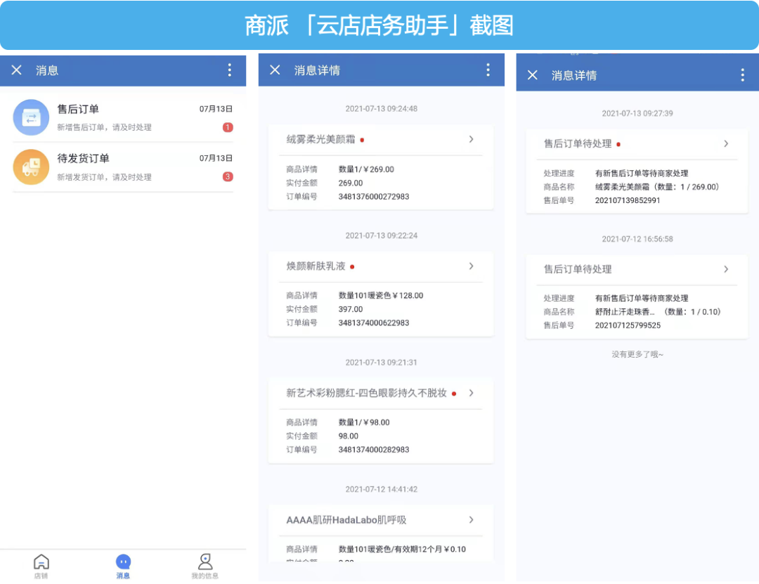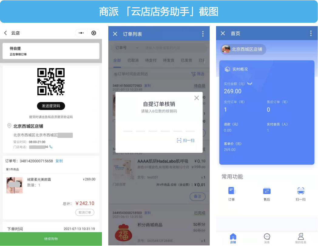 商派“云店店务助手”,是基于「企业微信自建应用」研发的一款移动端云店管理软件,集成了“云店订单全流程管理、售后全流程管理、到店核销/扫一扫以及企微消息订单和售后单通知”等店务管理功能,大大提高了云店订单履约效率,提升云店用户的购物体验。