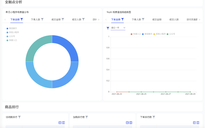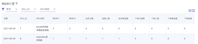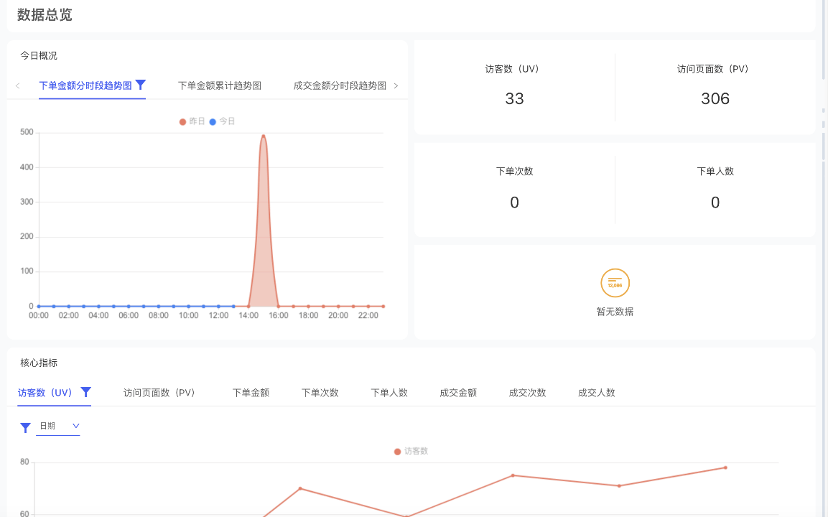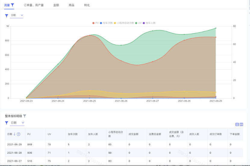 商品概况、单品分析、商品销售排行、商品分析对应PV、UV、加购次数、加购人数、下单订单数、下单人数、下单金额统计。