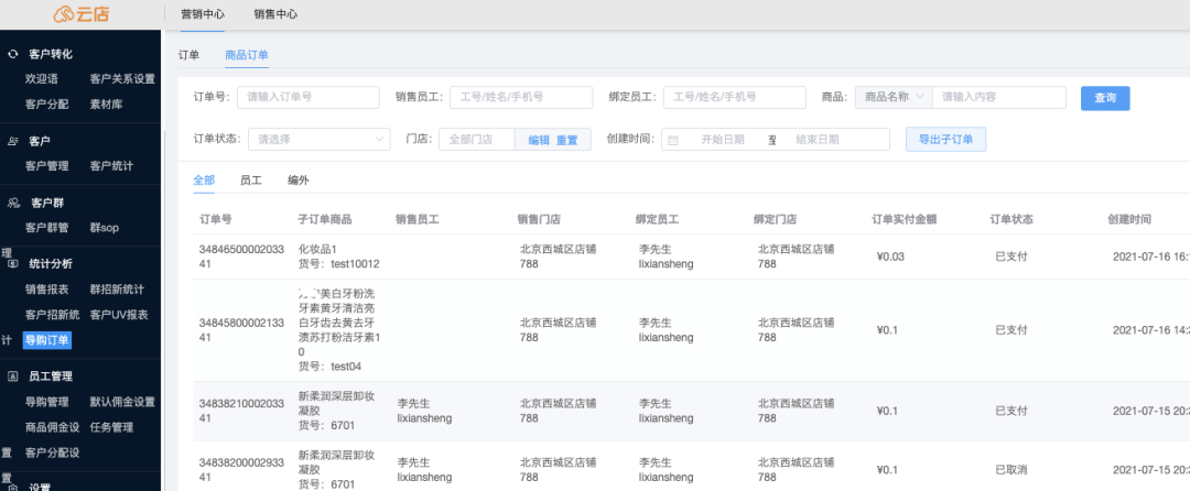 运营管理在基于商品品类的维度查看销量和业绩归属,通过商品维度的订单报表查询可一目了然,可将报表导出作为业绩计算与导购畅销品类销量统计的数据源