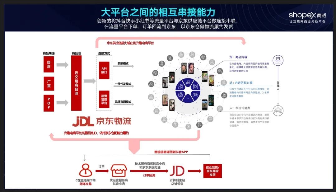 今年618,京东与抖音两大平台的合作系统已经打通,商派是负责订单系统对接业务的服务商之一。抖音平台和京东开普勒通过商派的oneX智能运营中台(OMS订单管理系统)进行系统对接。商派的oneX智能运营中台可以解决“订单统一”、“库存分配”、“数据集成”等基础问题,以及“系统集成拓展”和“人员使用拓展”的需求。