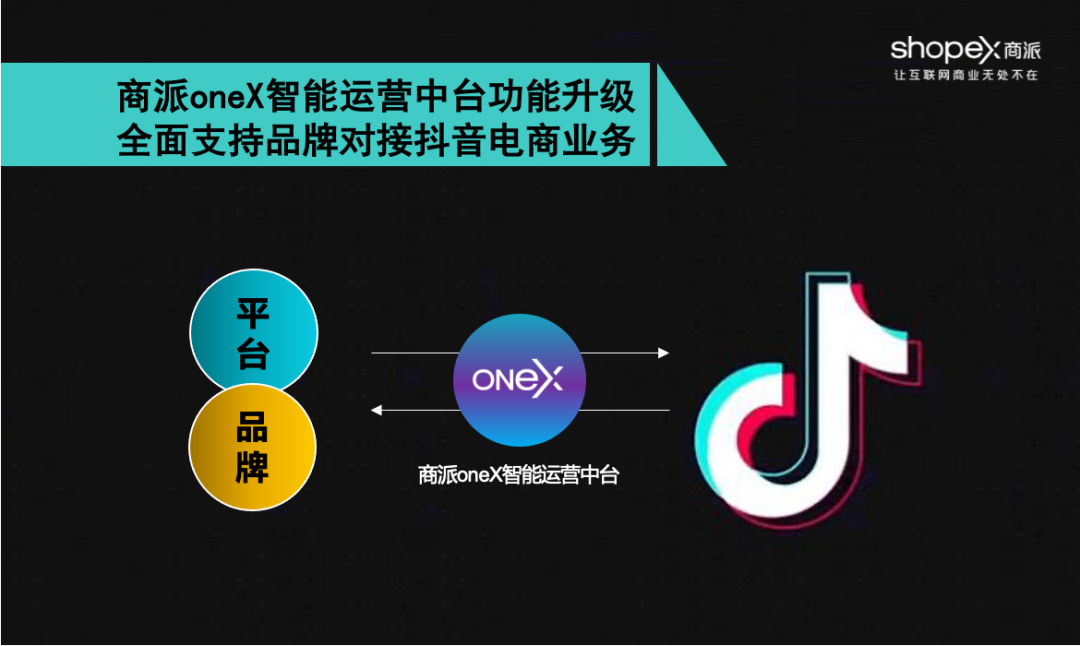 基于为京东和抖音两大平台提供了订单系统对接服务的经验,和对该场景业务需求的深度实践和理解,商派进一步升级了oneX智能运营中台中对接抖音平台的各项功能;此次功能升级可以帮助品牌企业更快速、更稳定和更高效的开展抖音电商业务,实现更多玩法。