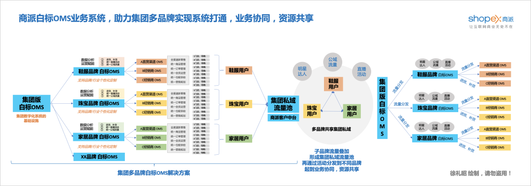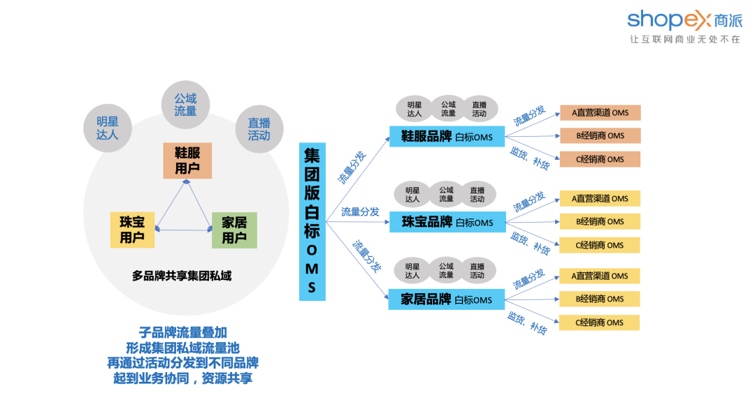 【4】如果子品牌和经销商都统一使用了白标OMS系统,则集团总部能够获得多品牌的客户数据和画像,形成“集团私域流量池”,最终通过活动运营将“集团私域流量”二次精准分发给各个子品牌和经销商,提高单个客户在集团内的价值贡献。实现营销资源和客户资源的内部共享。