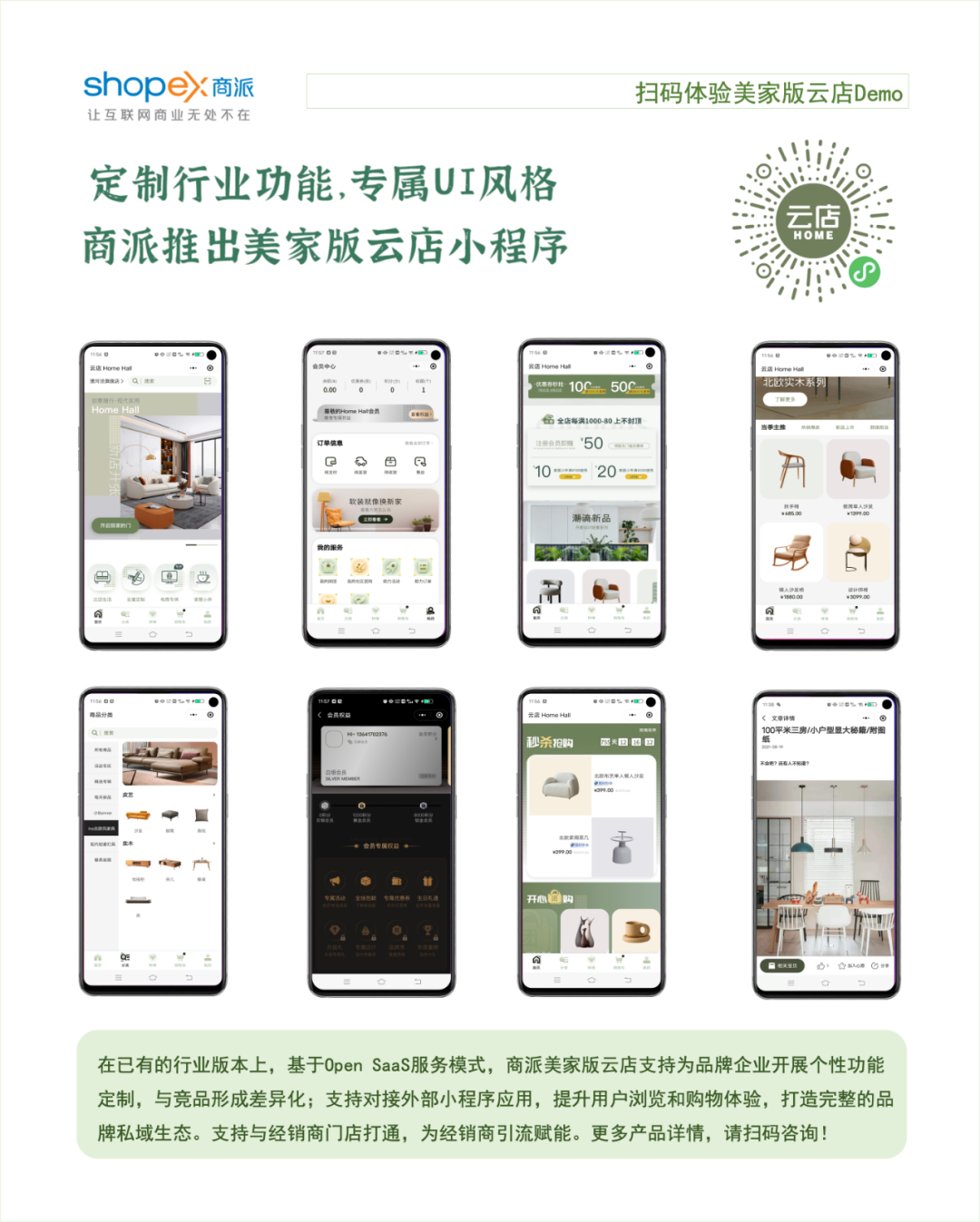 基于OpenSaaS服务模式,在已有的美家行业版本上商派还支持为品牌方开展个性功能定制,与竞品形成差异化;支持对接外部小程序应用,提升用户浏览和购物体验,打造完整的品牌私域生态;支持与经销商门店打通,为经销商引流赋能等。