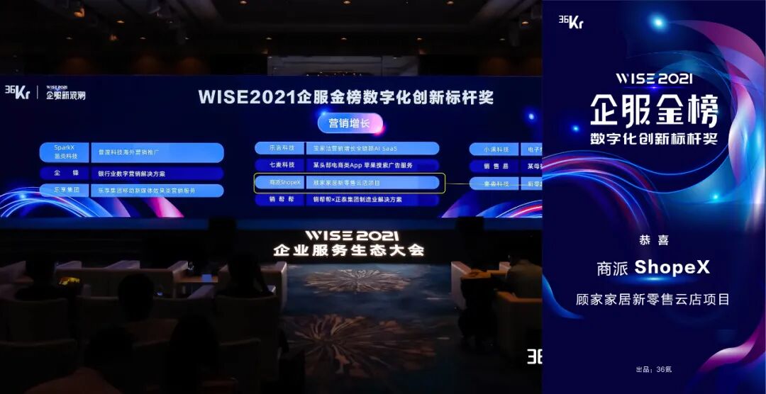会上36氪从 “产品”和“案例”两个维度发布了2021年度的 “中国企服软件金榜”与“数字化创新标杆奖”两个奖项榜单,以盘点企服领域的优秀厂商及案例。在众多数字化创新案例中,商派ShopeX凭借「顾家家居新零售云店项目」获得了“WISE2021企服金榜:数字化创新标杆奖”。