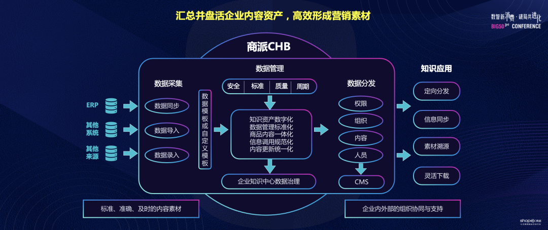 第二个是商派从0到1搭建了一个“内容数字化”管理系统——商派CHB。CHB可以有效盘活企业内部的内容资产,提高相关内容营销的管理效率。企业通过商派这样的素材中心的平台,能够将企业的原始素材、经营素材,分发到各个环节的素材进行统一的管理,最终去实现一个内容数字化,内容协同化的创新产品。这个产品目前已经成功交付给集团企业。
