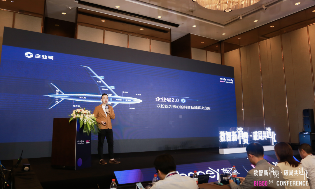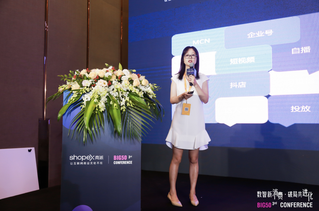 说到赋能,抖音企业号也是为品牌企业营销赋能的核心平台。本次商派BIG50品牌交流会也有幸邀请到了巨量引擎企业号产品总监吴真,在现场分享了《800万企业已入驻:抖音私域怎么做?》