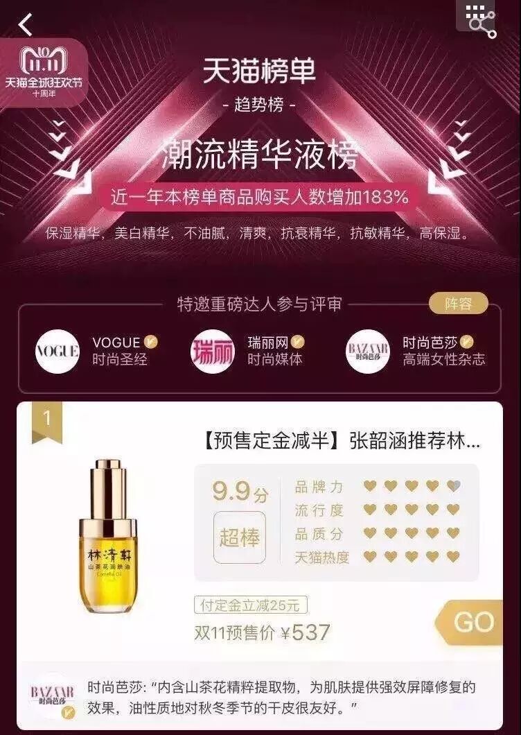 此前,天猫发布“潮流精华液榜”,林清轩山茶花润肤油、山茶花修复肌底精华液分别占据了榜单冠军和第4名,这对于国货品牌而言还是第一次。据统计,截止目前已经有上百位明星网红和行业名人,推荐过林清轩山茶花修复系列产品。当红的林清轩似乎集万宠于一身,其光芒不亚于任何一个国际大牌,也让国外企业看到了“中国民族品牌”聚变的力量。