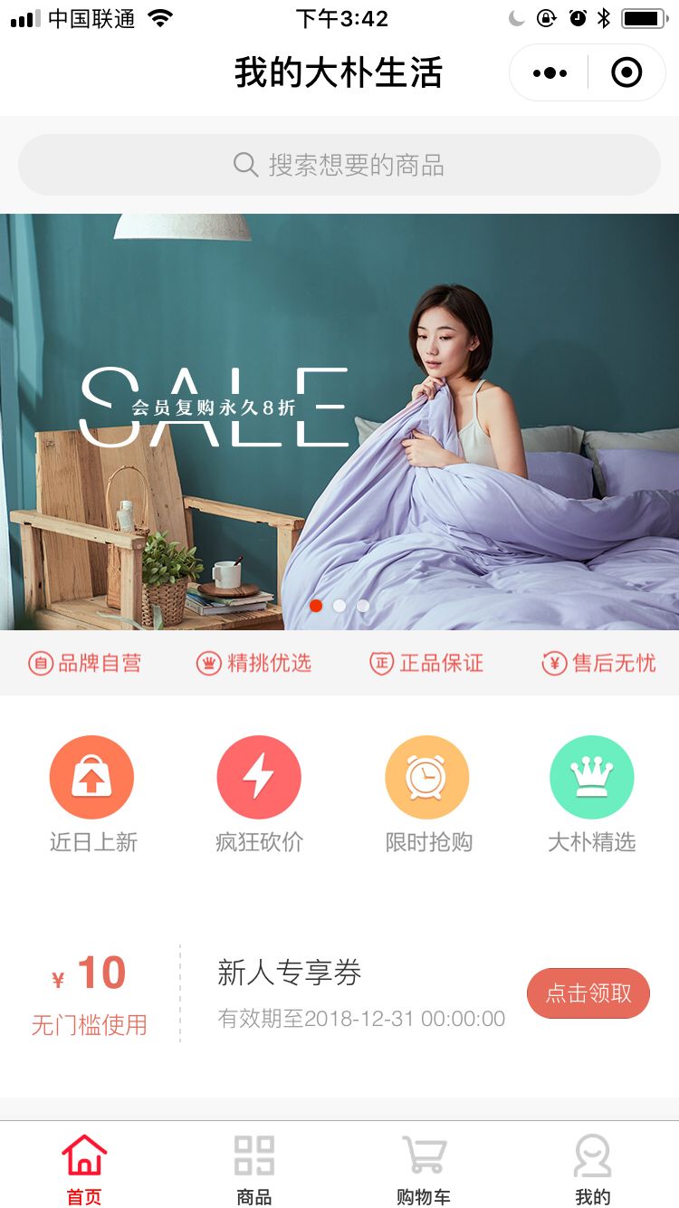 大朴商城整体风格偏日系简洁,以舒适自然为主。目前主营的产品线涵盖四件套、芯类、巾类、内衣裤、文胸、袜子、拖鞋、婴童、家居服、纸巾、洗护用品、智能家居品等十余个品类。