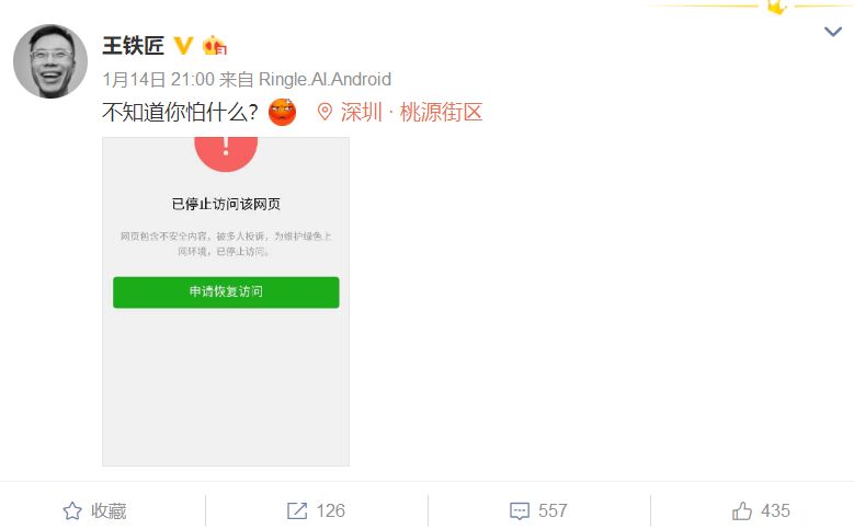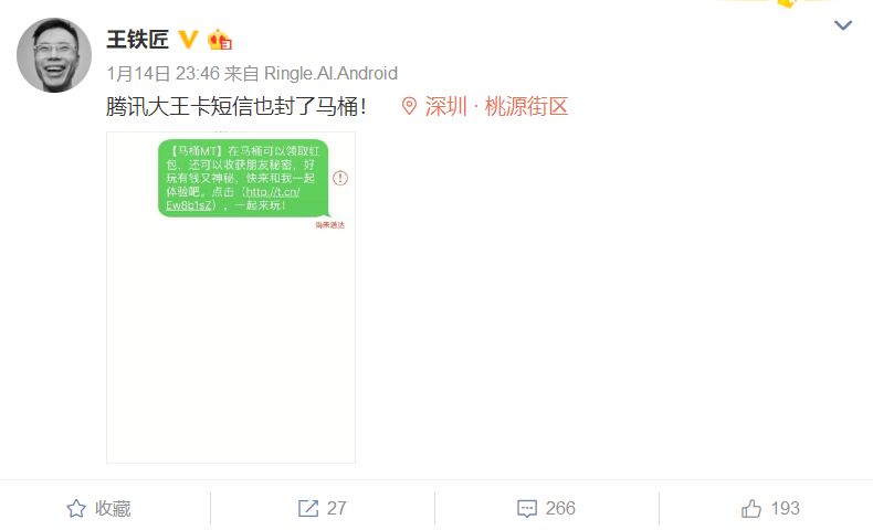 先是快播王欣发布的“马桶MT”出师未捷身先死,内测不到一个小时,微信页面上的下载链接就被微信封了。由此引发了王欣的正面叫板:
