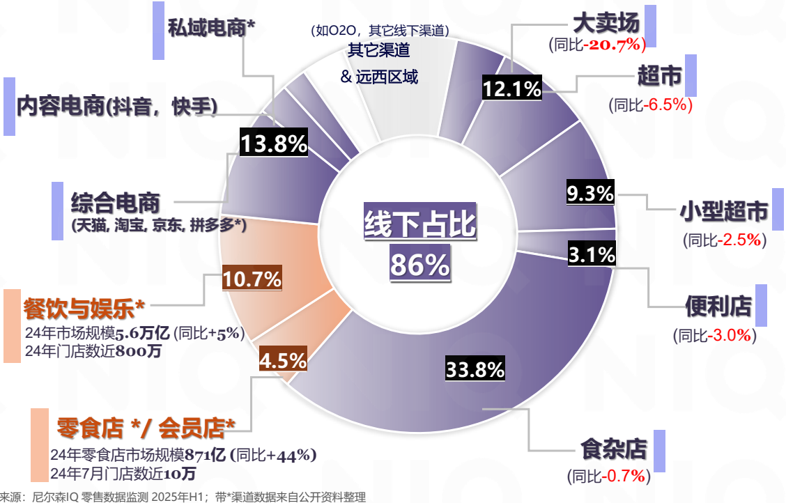 2025年上半年零售渠道表现分化且竞争激烈。全渠道快消品销售额增长4.7%,其中线上渠道增长21.1%,线下渠道下降4.3%,显示渠道结构正在发生深刻变革。