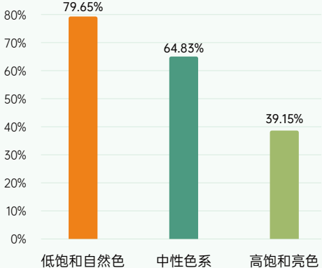 色彩选择方面,79.65%的设计师选择以“低饱和自然色”为主,64.83%的设计师选择中性色作为“万能背景板”,39.15%的设计师用“高饱和亮色”作为空间的“点睛之笔”。