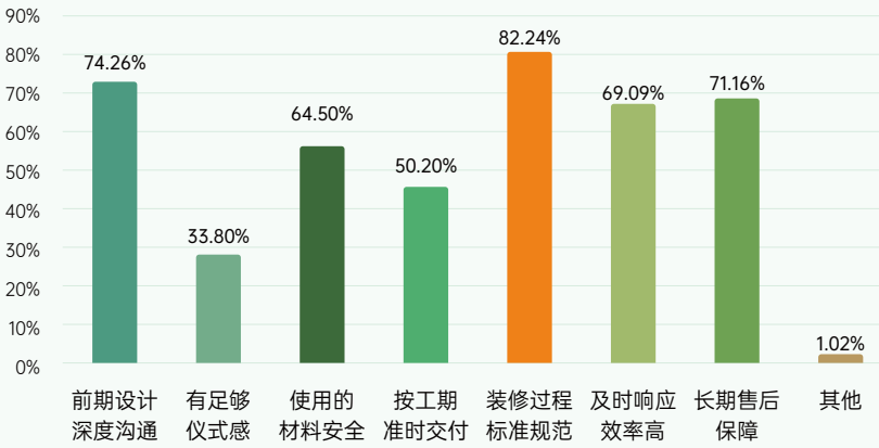 家装服务正从“一次性交易”向“全生命周期陪伴”升级。调研显示,74.26%的客户期待设计师“先懂生活,再做设计”;82.24%的客户重视“施工标准与规范”;71.16%的客户需要“售后保障”但更期待“长期生活支持”。