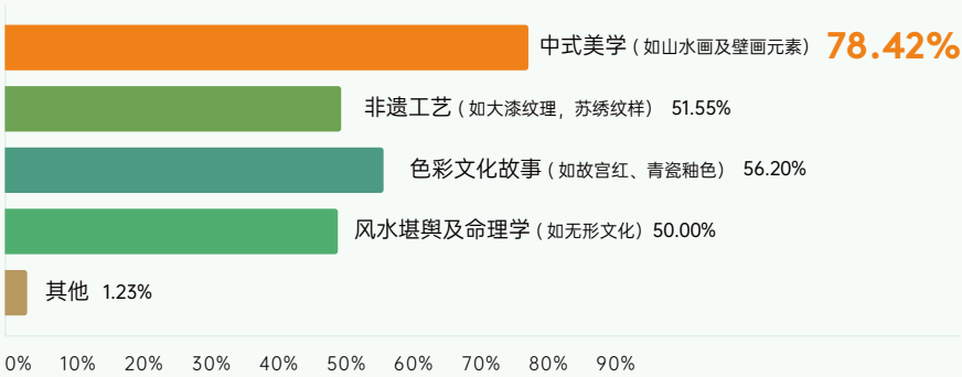 中式元素现代化创新演绎成为潮流。78.42%的设计师会在作品中融入“中式美学”,但均以现代视角重构,打破传统与现代的壁垒。