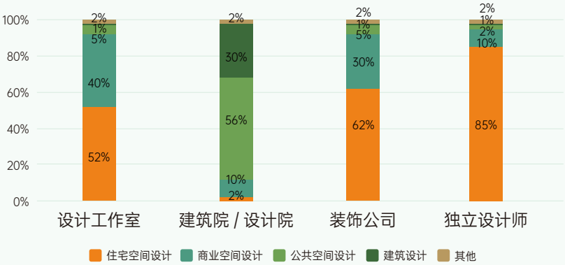 超过四成的设计师从业10年以上,1-3年的年轻设计师占14.15%。84.46%的设计师主要做私宅(住宅、公寓、别墅),55.17%的设计师从事商业空间设计。