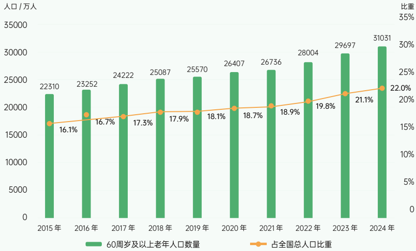 银发族适老需求凸显,“享老”赛道值得关注。2024年末,全国60岁及以上人口已突破3亿,占全国人口的22.0%。老年群体的消费能力与观念正同步迭代,从“被动适应养老”到“主动享受生活”的转变,为适老化家居开辟出更具活力的需求场景。