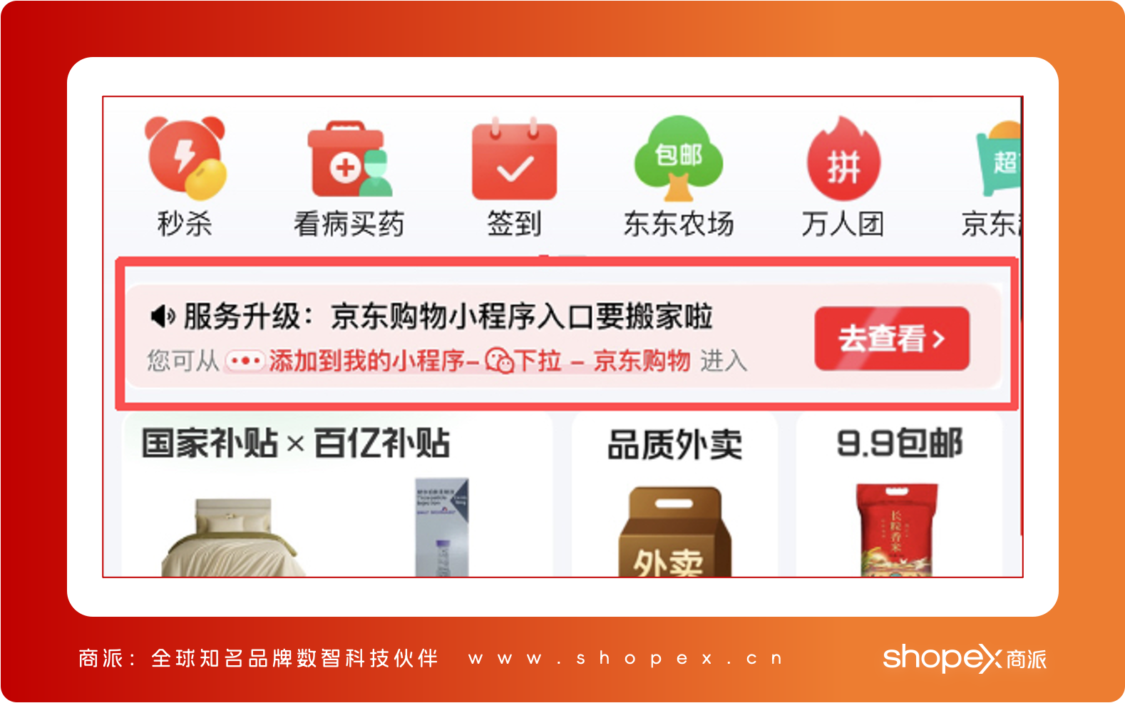 微信关闭京东入口的决策,反映了腾讯对流量分配方式的重新思考——从“入口绑定”转向“流量分布式”策略。 腾讯正加速推进“去中心化”的电商玩法。以前它主要依赖给京东输送流量,而现在微信希望把流量更均匀地分配给更多中小商家,形成一个更开放、更公平的电商生态。 对于京东而言,短期可能会面临流量压力,但长期来看,减少对外部流量的依赖可能使京东更专注于完善自己的平台生态。京东近年来也在不断扩大盟友圈,与华润集团、万达、小红书等企业达成合作。 对于整个行业,这一变化标志着互联网流量分发逻辑的“升级换代”。超级入口的红利期已过,品牌和平台都要学会多点布局、多元触达。