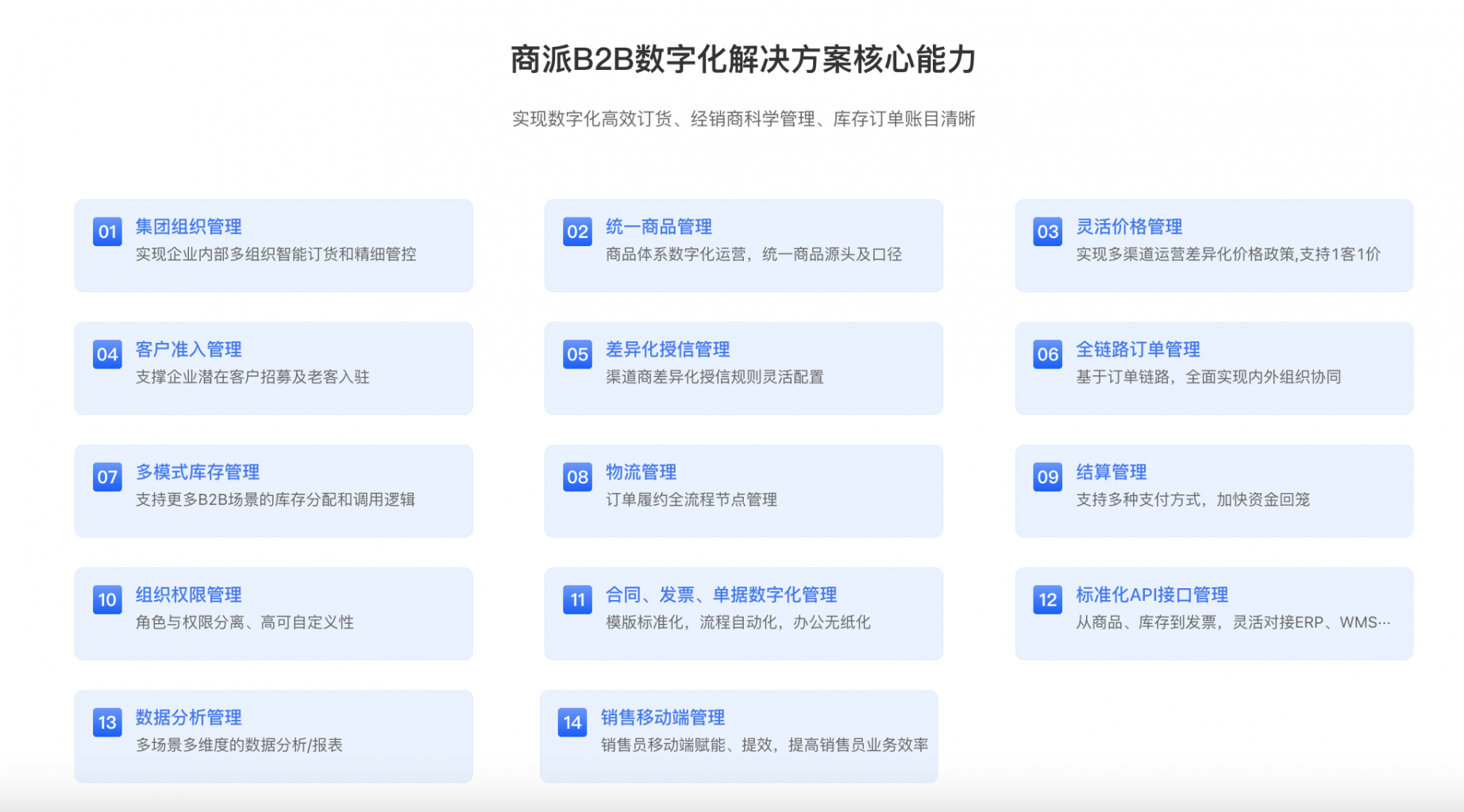 商派B2B系统主要面向品牌企业、制造业、工业品等行业的渠道管理需求,提供三种核心解决方案以适应不同业务场景: