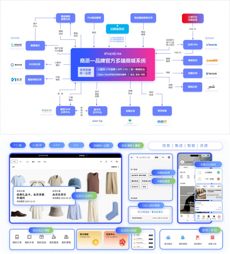 商派多端零售商城系统采用统一架构,支持企业构建覆盖多个触点的数字化销售网络: 系统架构特点: