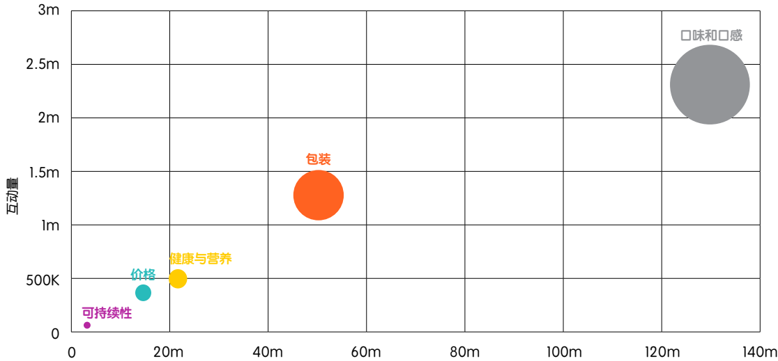 数据分析显示,相比价格等其他因素,口味和口感更受消费者关注,也更能吸引消费者。在社交媒体上,零食话题的讨论主要集中在口味和口感方面。对五大属性的分析发现,关于零食味道和质感的讨论占整体话题量的33.8%。相比之下,排名第二的包装属性仅占讨论量的21.3%。