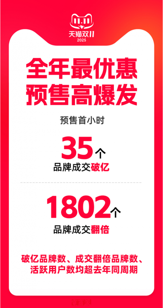 - 2025年天猫双11首小时战报:80个品牌成交破亿,AI调用超过150亿次;40万家门店接入闪购服务