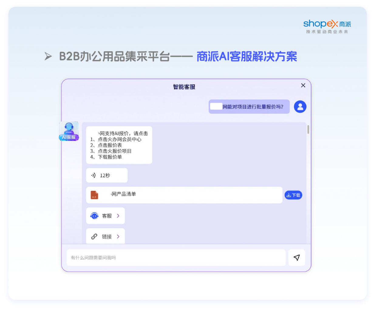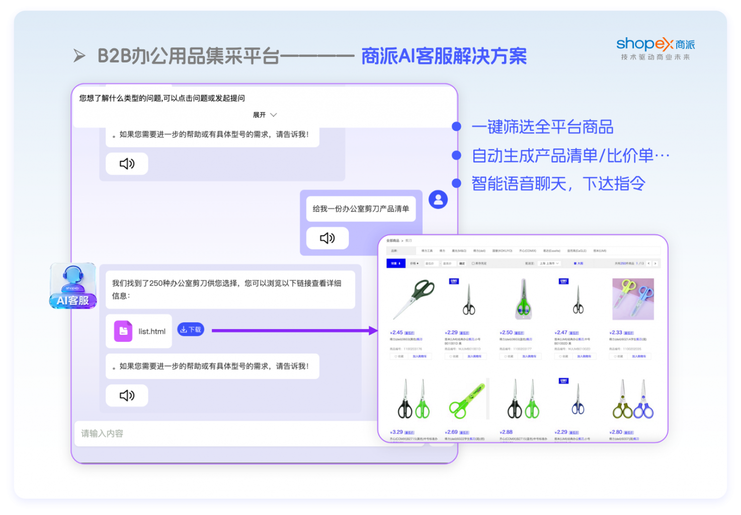 以一个典型的为企业提供办公用品的B2B平台为例,商派AI智能客服并非一个简单的问答机器人,而是一个深度嵌入采购业务全流程的智能操作中枢。