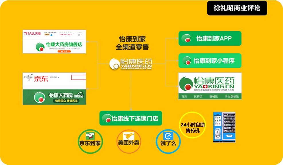 从2015年起,为了应对互联网技术所带来的市场与消费者购物习惯的变化,怡康医药建设了:京东和天猫旗舰店、自营PC网上药店、微信小程序微商城、怡康到家App、24小时自助智慧售药机、400全国免费送药电话等在内的渠道。为消费者提供随时随地随心购的全渠道零售服务。