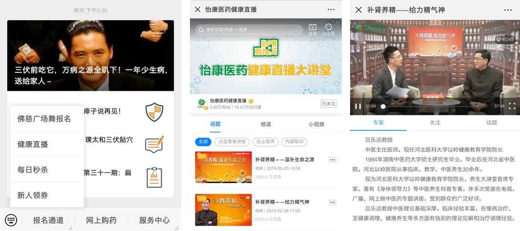 例如,在线下的顾客,通过扫码留存在怡康医药的微信自媒体和APP上,并且通过健康类图文内容和专家线上直播等形式导入新流量。