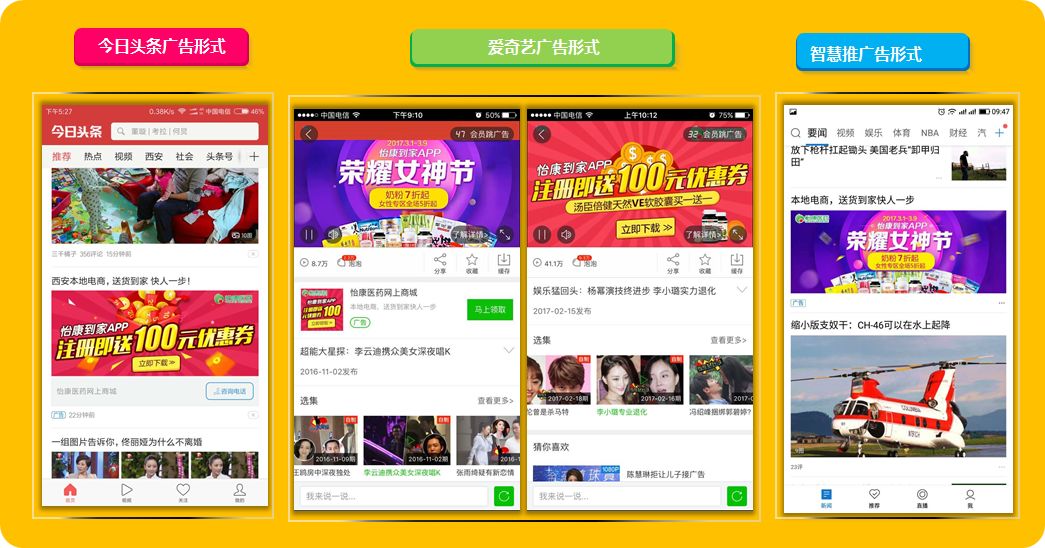 引流活动推广:怡康到家利用“新人注册送100元优惠券”活动,将活动页面投放到手机端的 今日头条、爱奇艺等平台,并结合智慧推广系统扩大新人下载注册的数量。