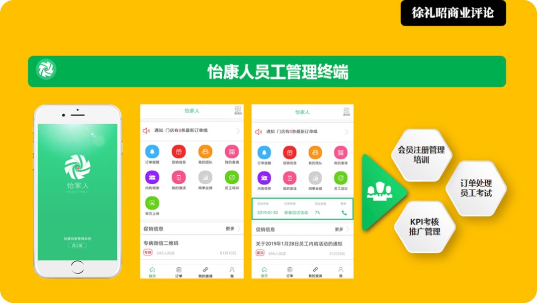同样还是基于商派的技术框架,怡康医药研发了一款「怡家人」APP,即只有怡康员工可以使用的专属APP,它是「怡康到家」订单信息、促销信息的传达者。