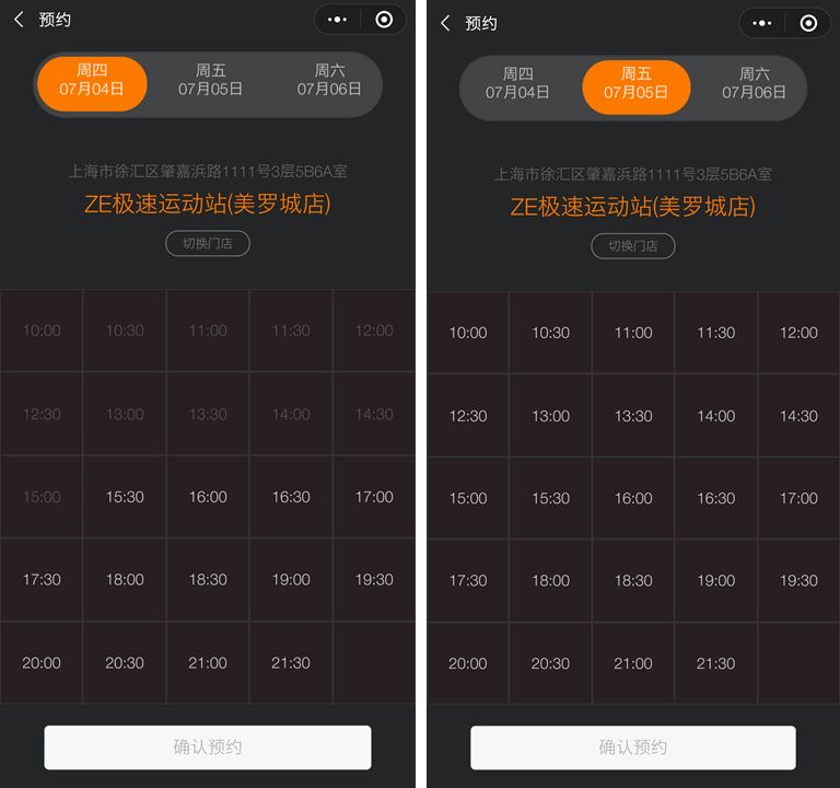 为了提高老师上课的效率,ZESPEED通过商派的预约型小程序,将老师的时间以30分钟为一单位,从早上10点划分到晚上9:30,一共划分出24个可以预约的时间段。小程序上实时更新预约信息,已经被预约满的门店和时间段则不能被预约,这样的话,就可以做到精准管理会员的上课时间,做到健身资源的最优分配。