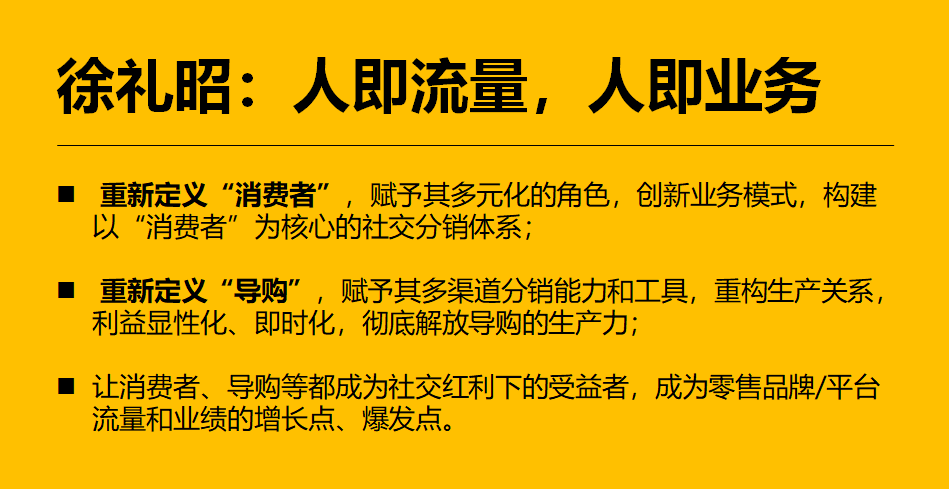 重新定义“消费者”,创新业务模式,赋予其多元化的角色,构建以“消费者”为核心的社交分销体系。重新定义“导购”,赋予其多渠道的分销能力和工具,重构生产关系,利益显性化、即时化,彻底解放导购的作战能力。让“消费者、导购”等都成为社交红利下的受益者,成为品牌/平台流量和业绩的增长点与爆发点。
