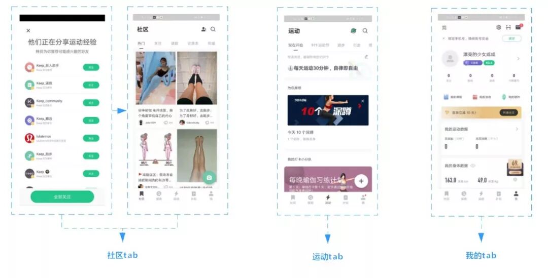 Keep产品模块包含:工具属性业务模块(跟练/运动);社区属性业务模块(包含内容和社交);电商属性业务模块这三大业务类模块。