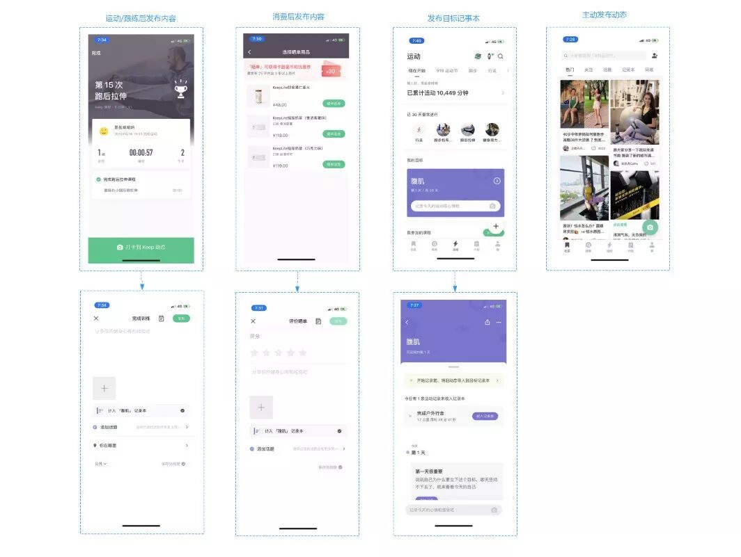 跟练后引导发布动态,消费后引导晒单发布动态,完成目标打卡记事本记录当日运动数据发布动态,主动发布动态(分为主动发布和被动引导两种情况)。